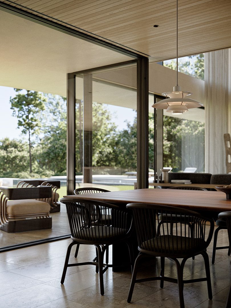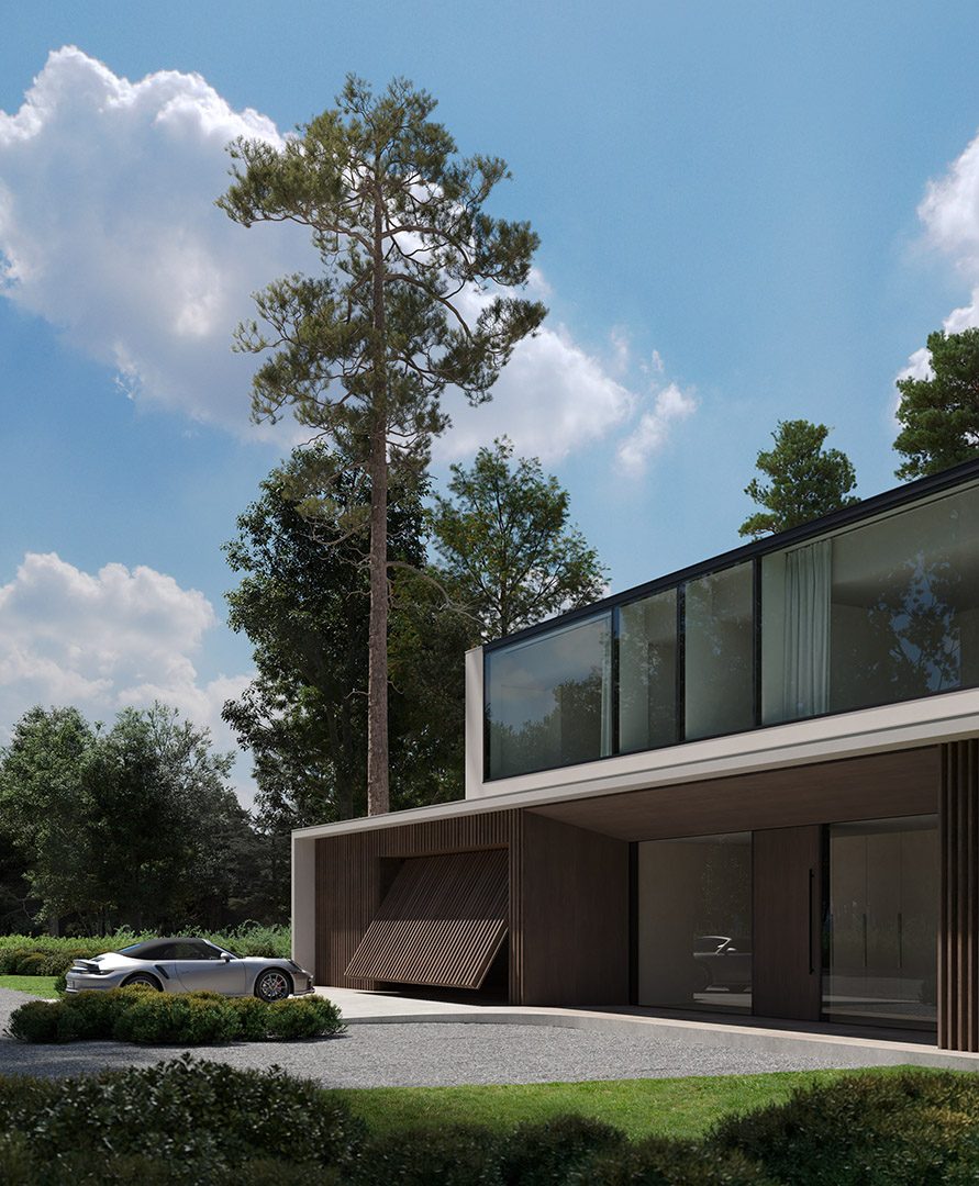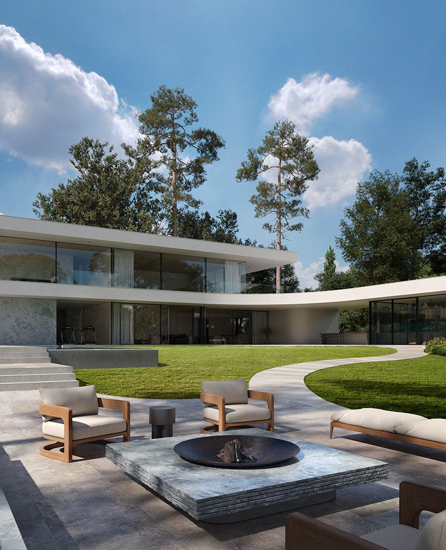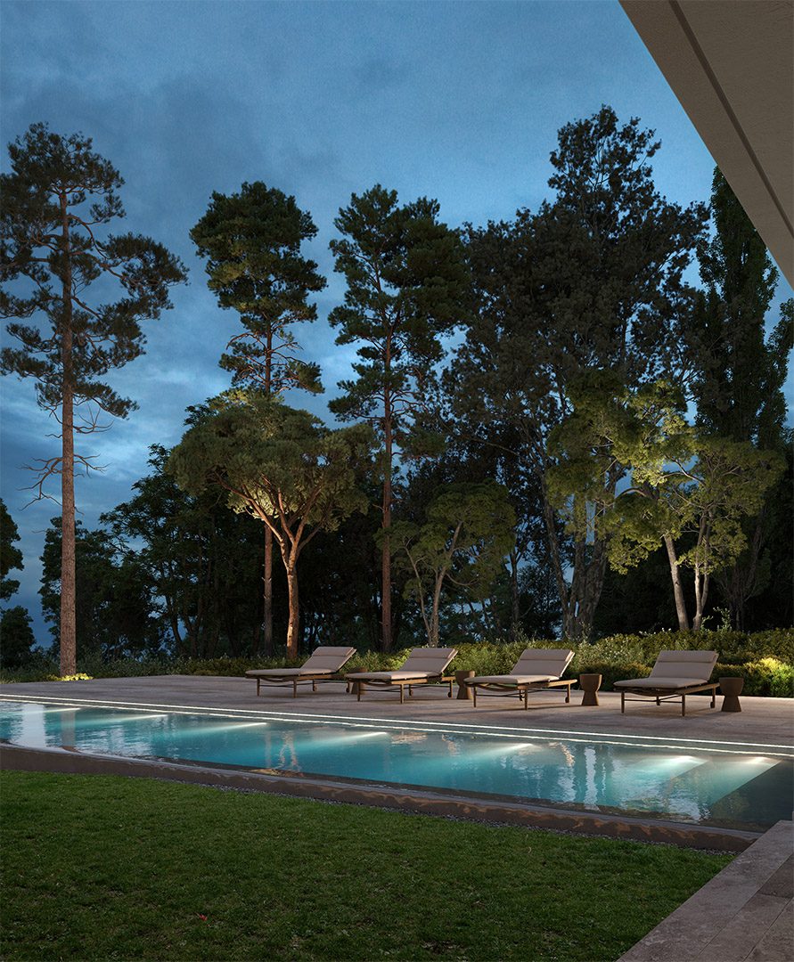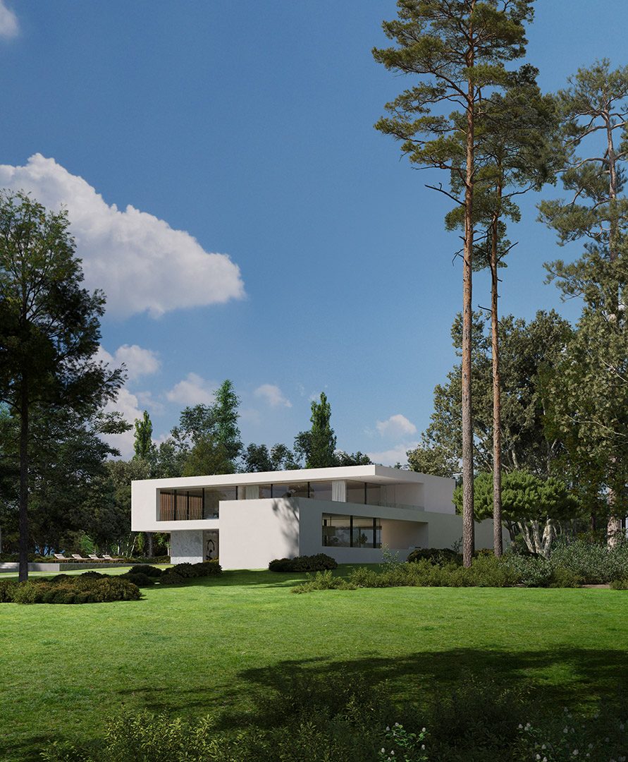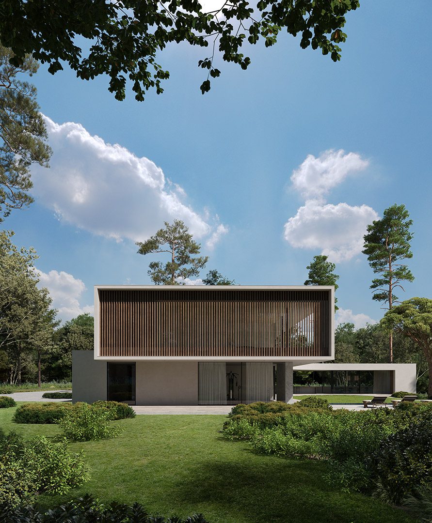 4 bedrooms, 5 bathrooms, gym, sauna, two-level living room connected with dining area and kitchen, 2-car garage, wardrobes, tech rooms, outdoor kitchen, outdoor swimming pool, dining pavilion.