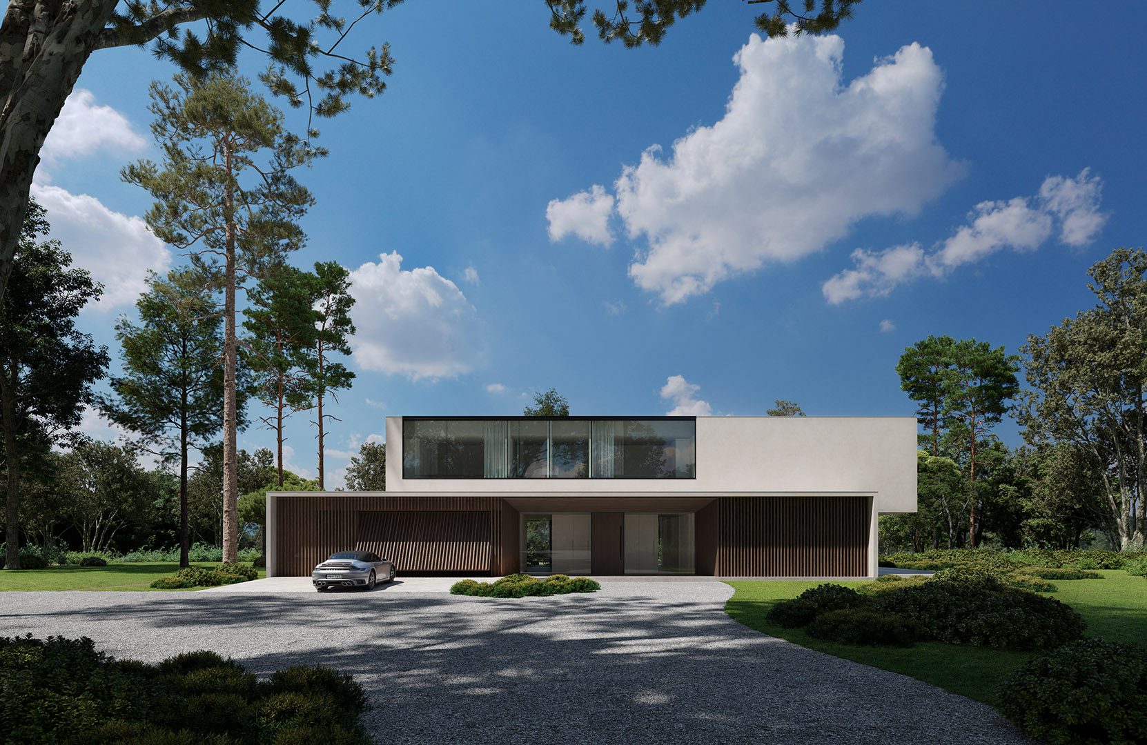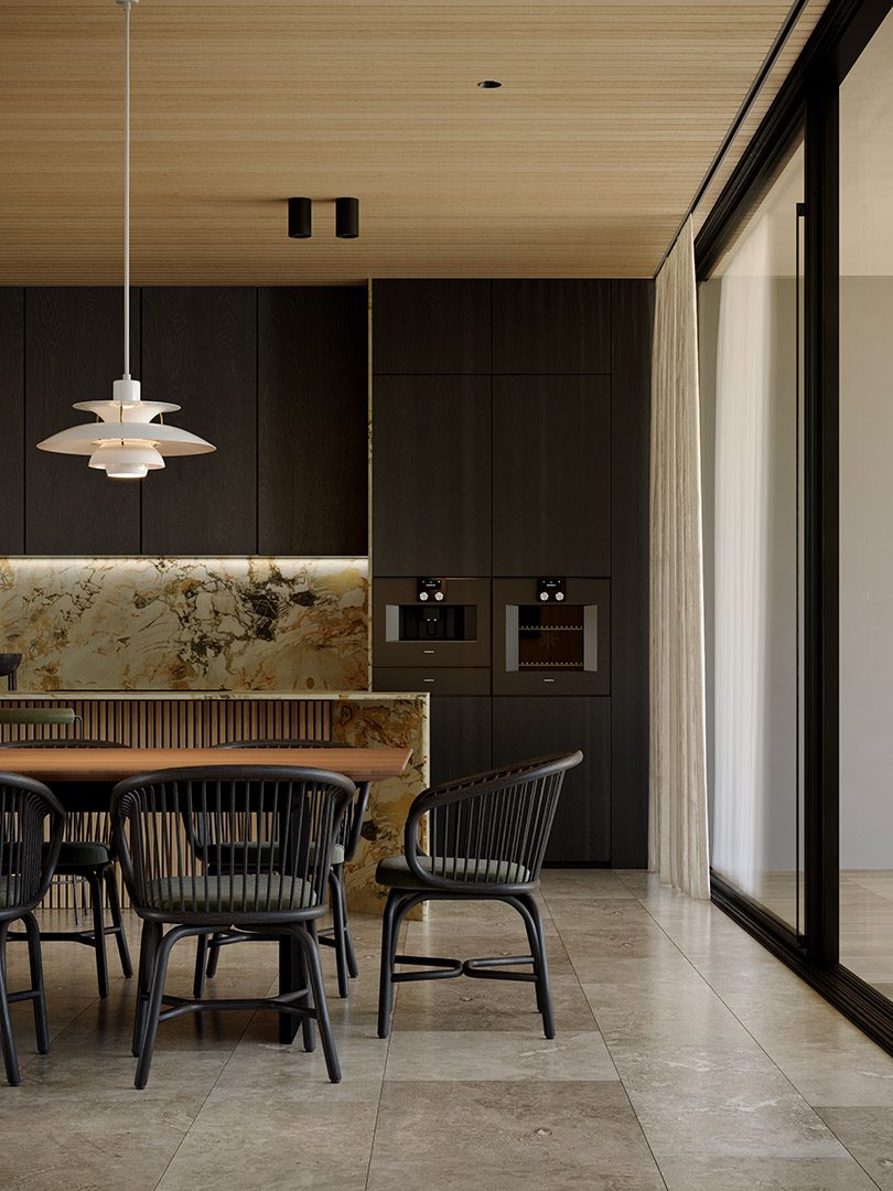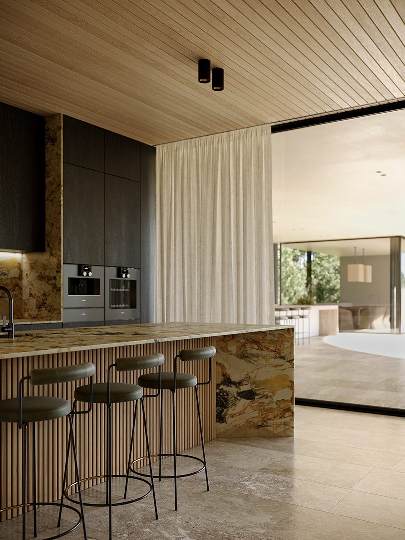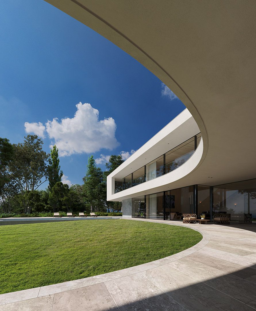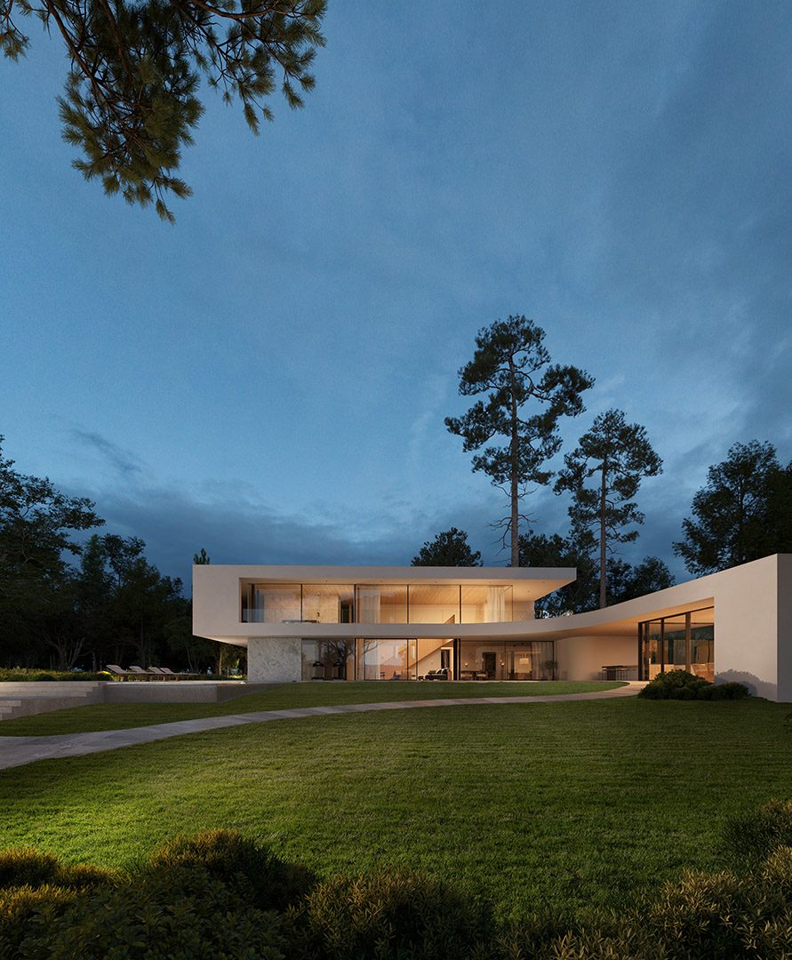 4 bedrooms, 5 bathrooms, gym, sauna, two-level living room connected with dining area and kitchen, 2-car garage, wardrobes, tech rooms, outdoor kitchen, outdoor swimming pool, dining pavilion.