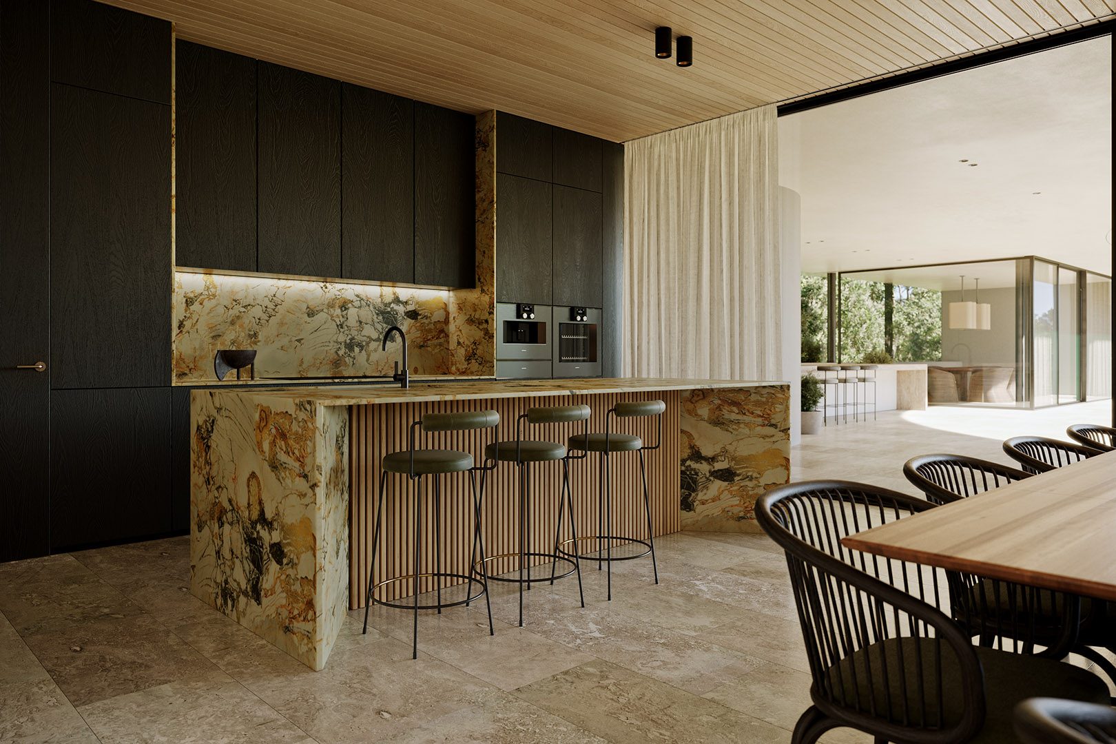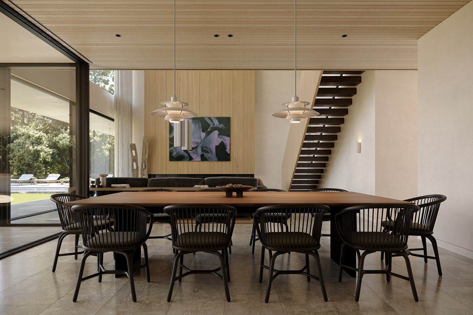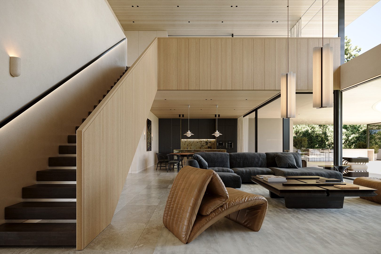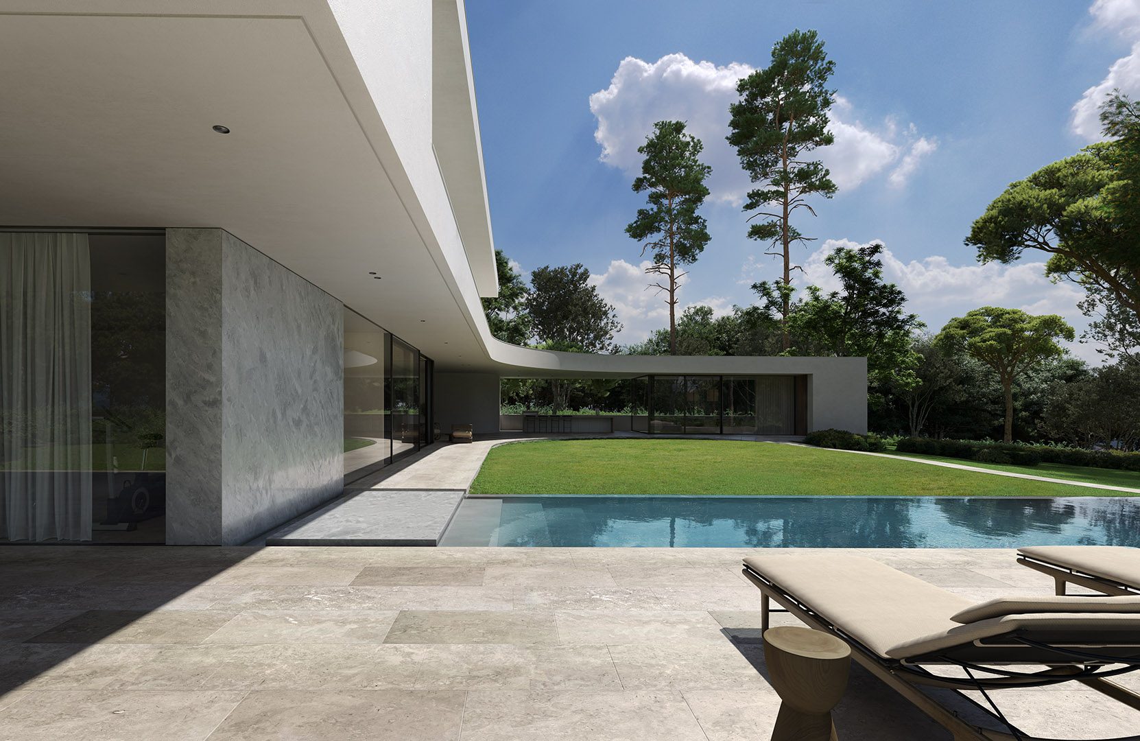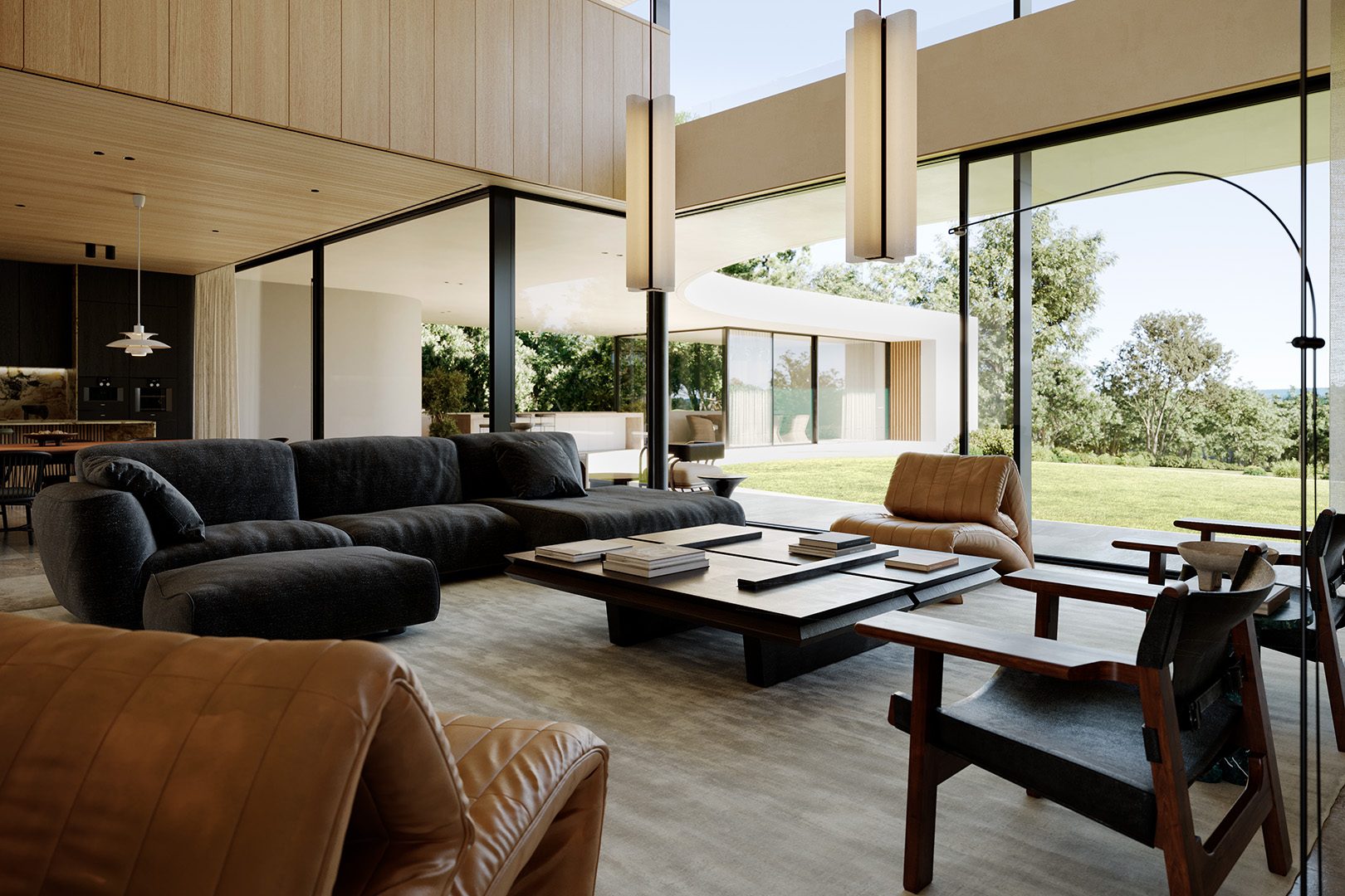 4 bedrooms, 5 bathrooms, gym, sauna, two-level living room connected with dining area and kitchen, 2-car garage, wardrobes, tech rooms, outdoor kitchen, outdoor swimming pool, dining pavilion.
