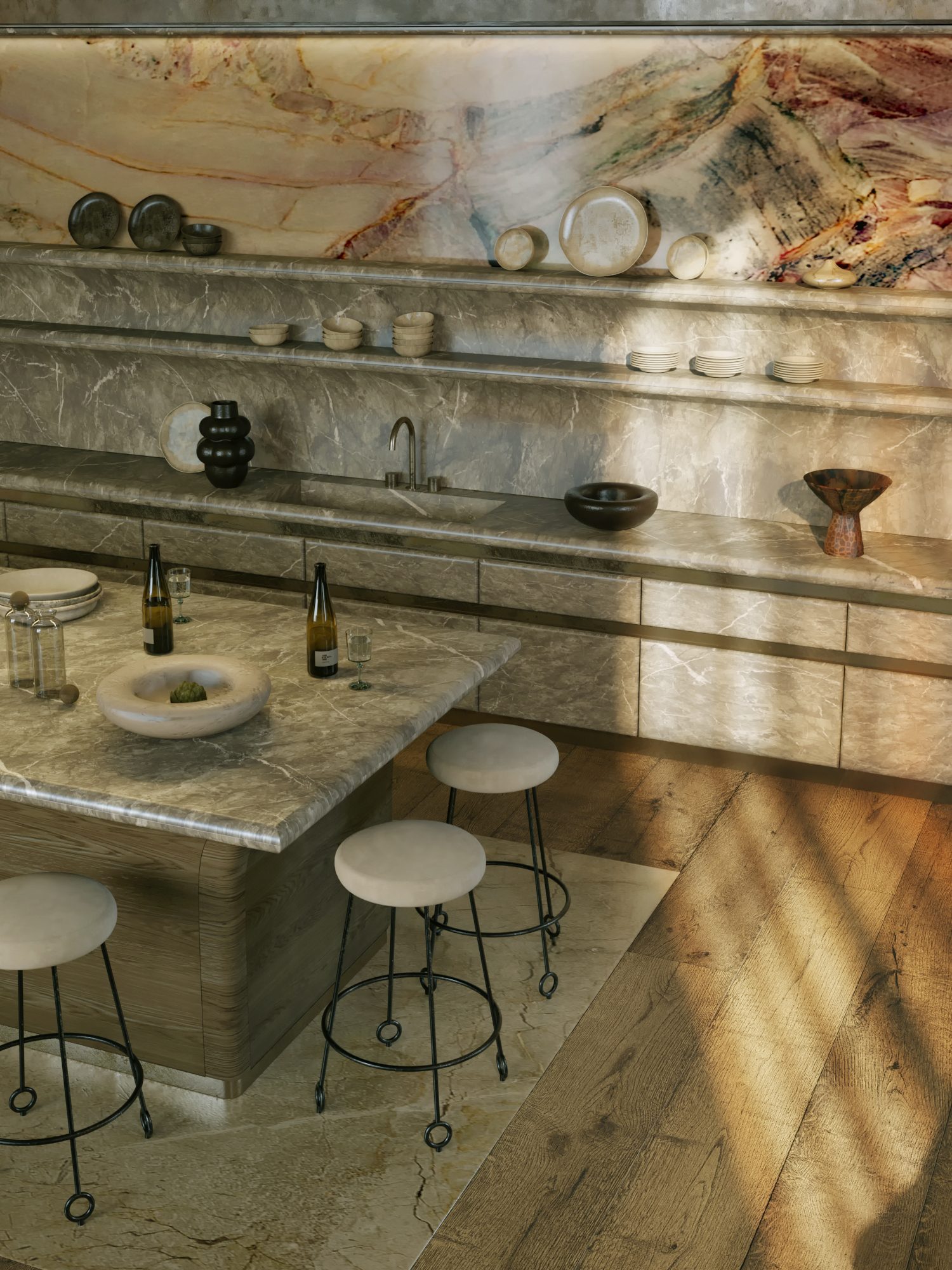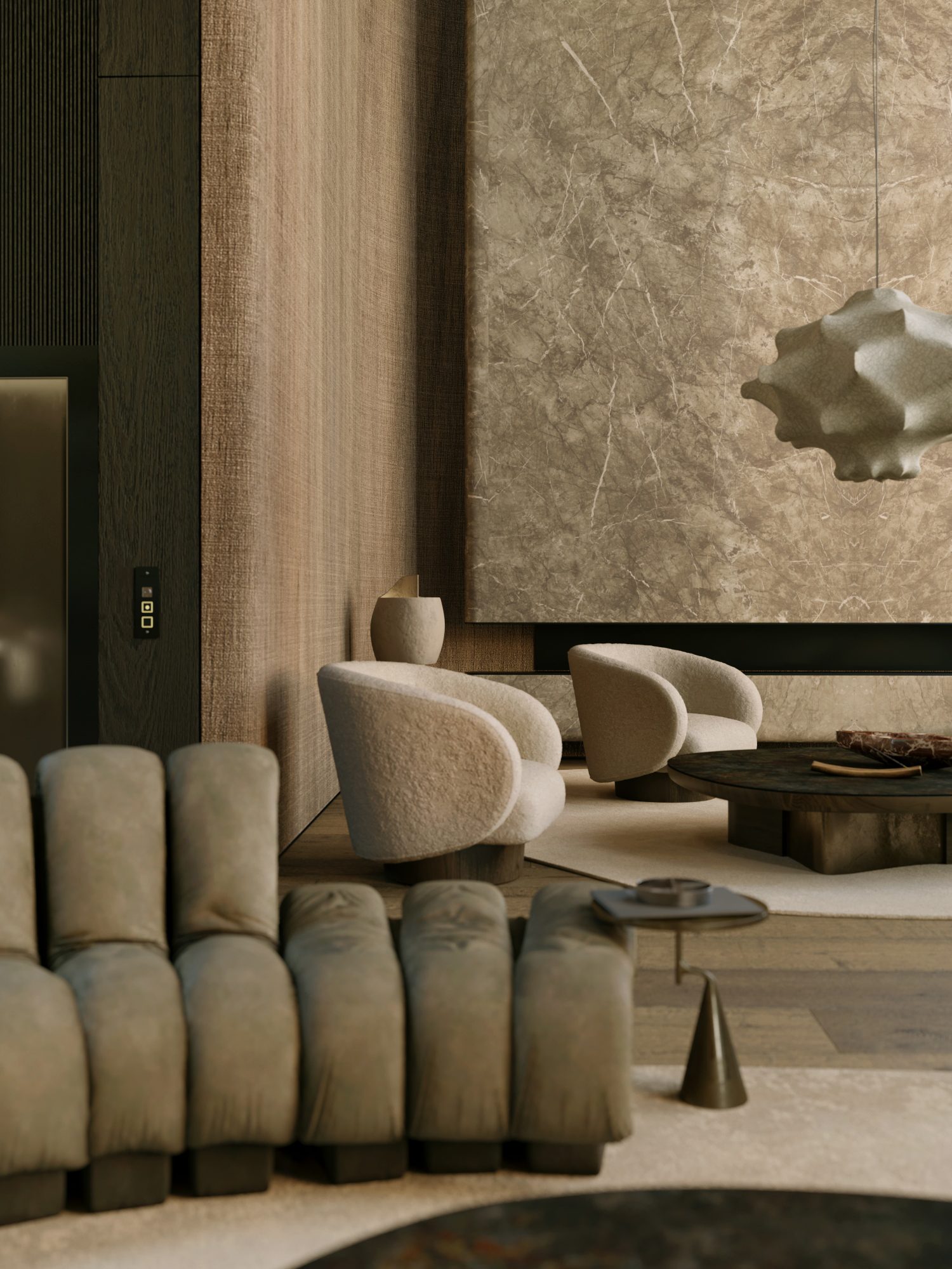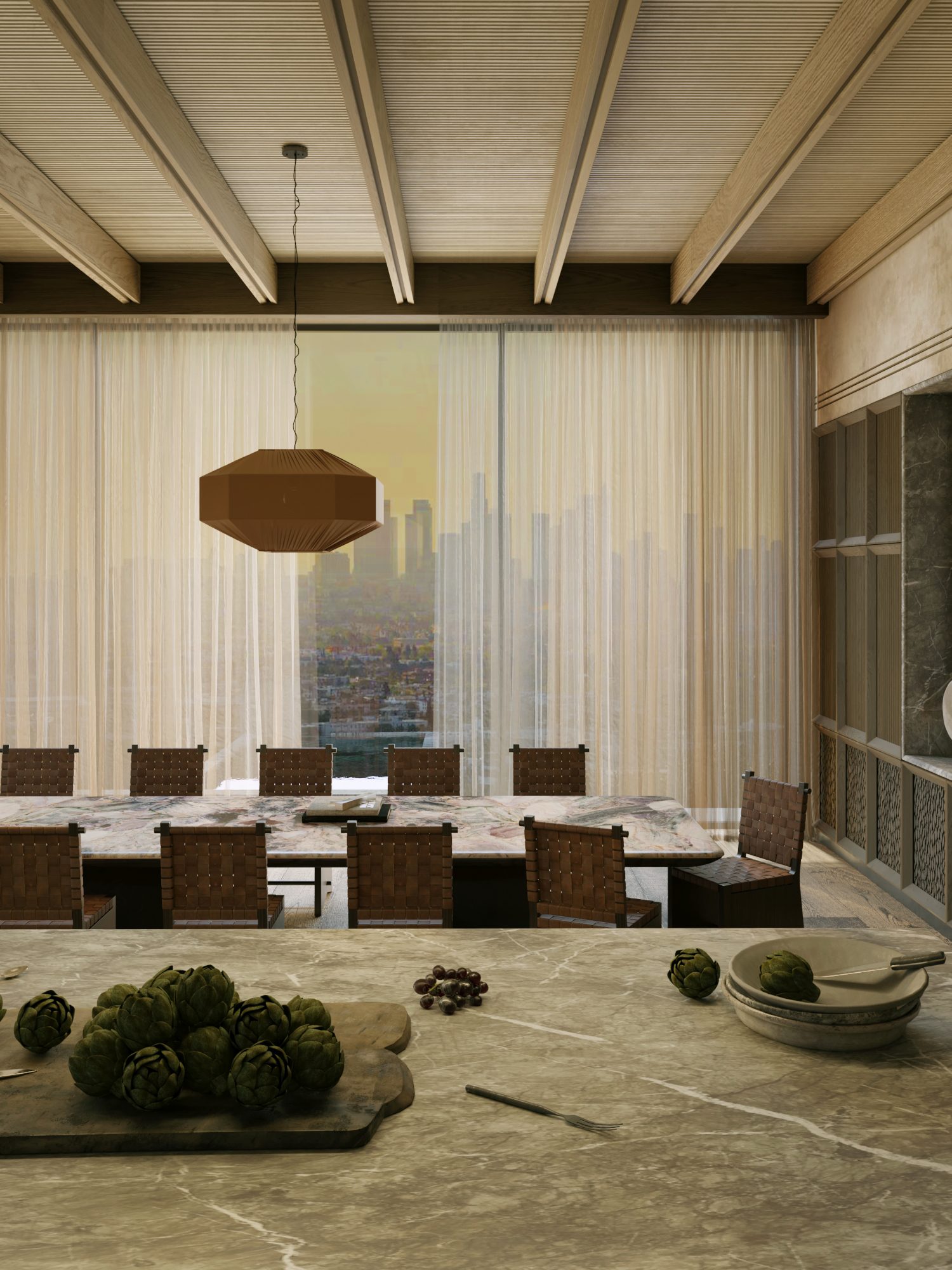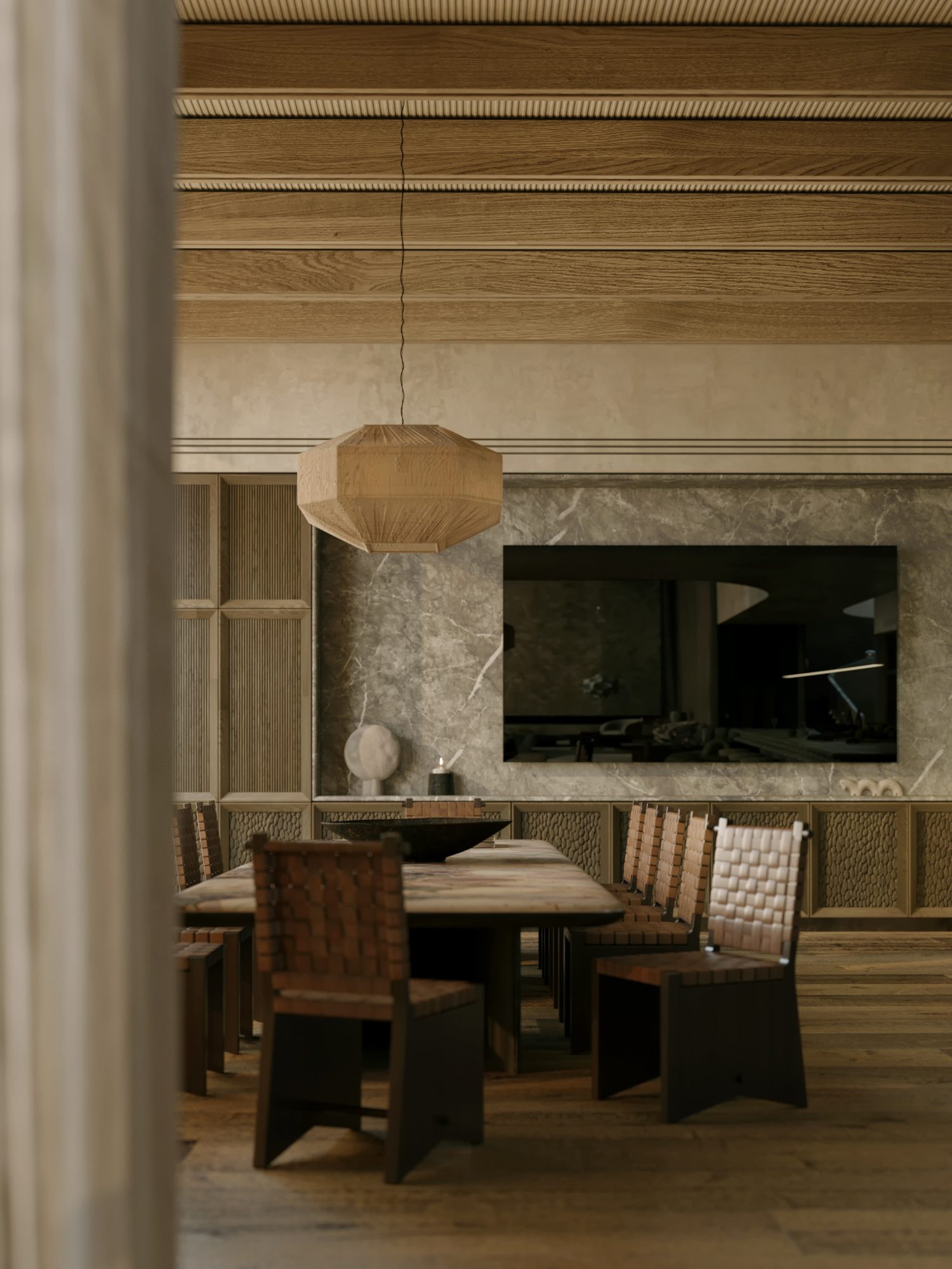 2 floors, 3 bedrooms, set of family spaces, set of guest spaces, open kitchen, home office, set of service premises.