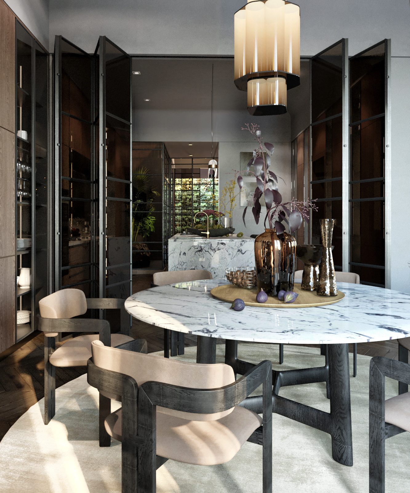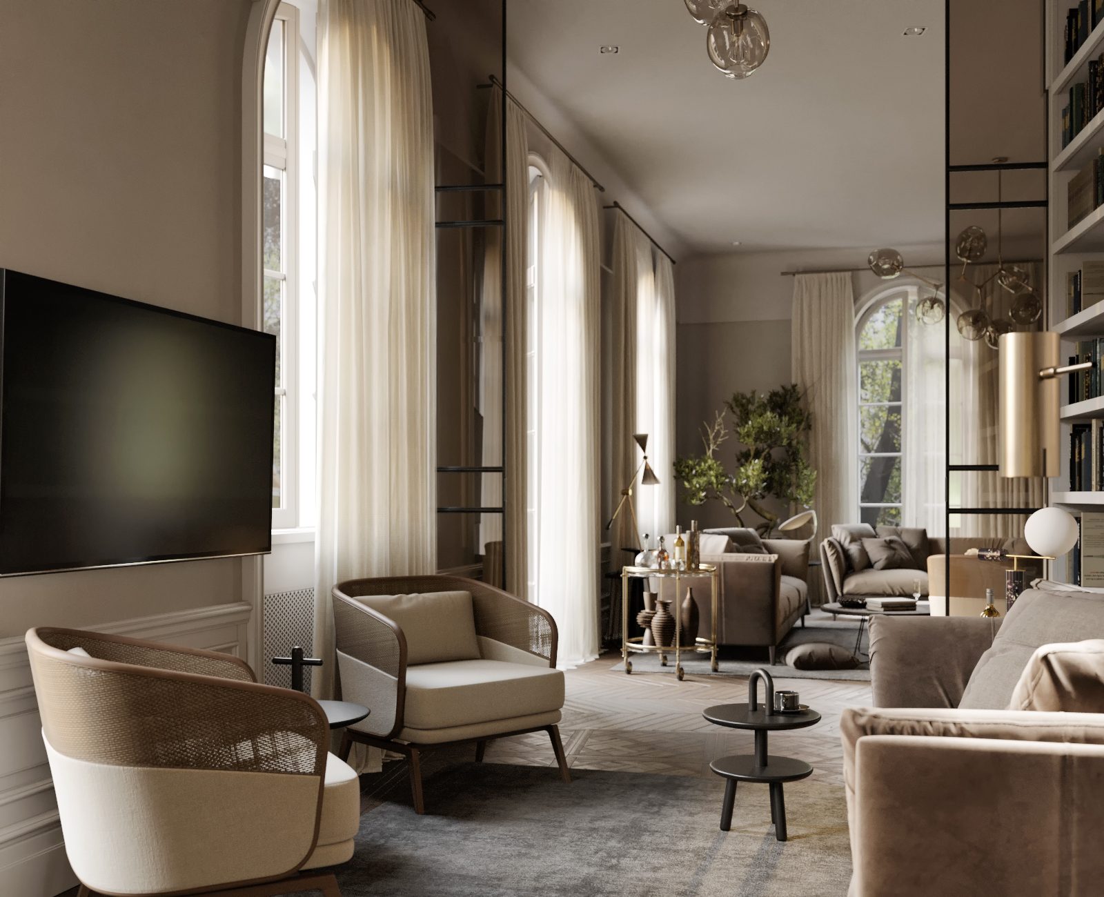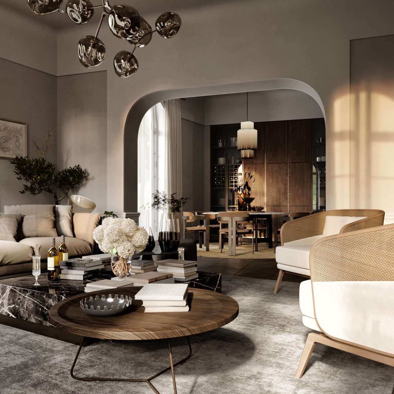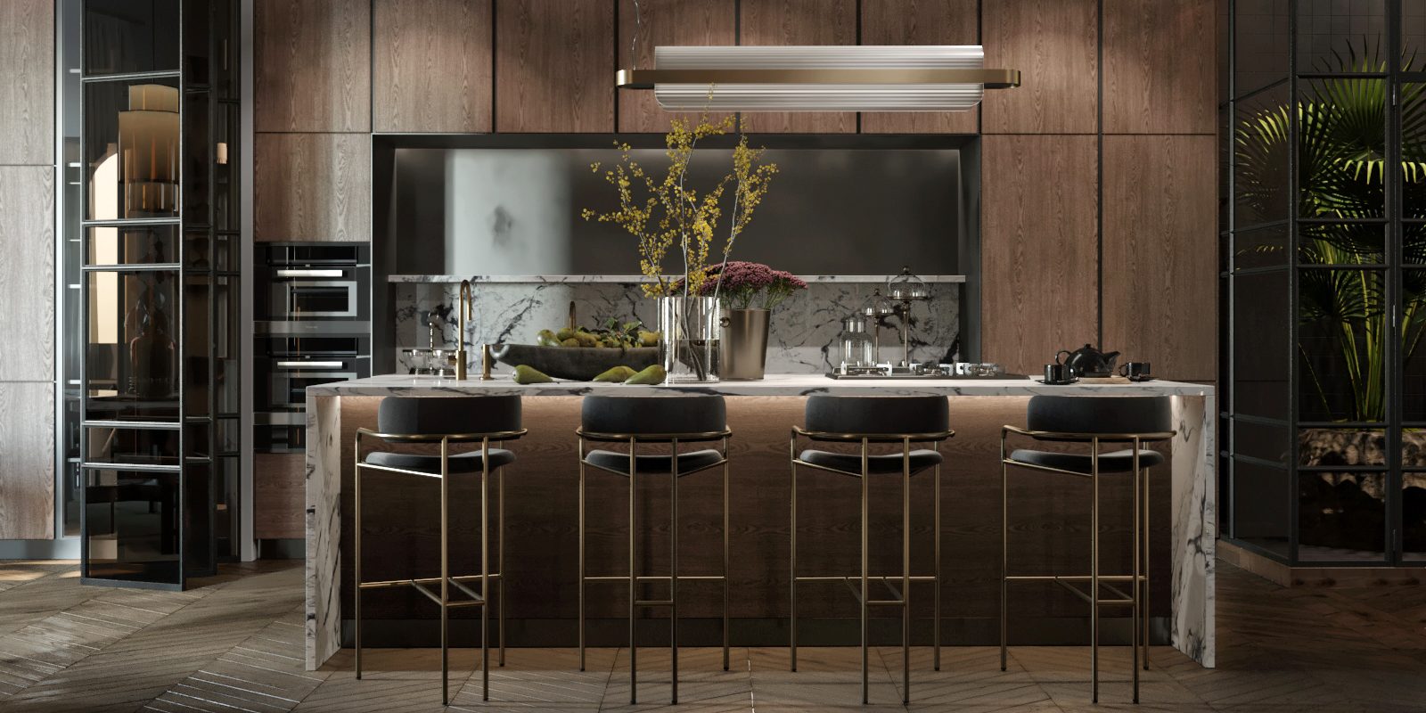 Living room, dining room, kitchen, library, chill room, two winter gardens, master bedroom, guest bedroom, three bathrooms