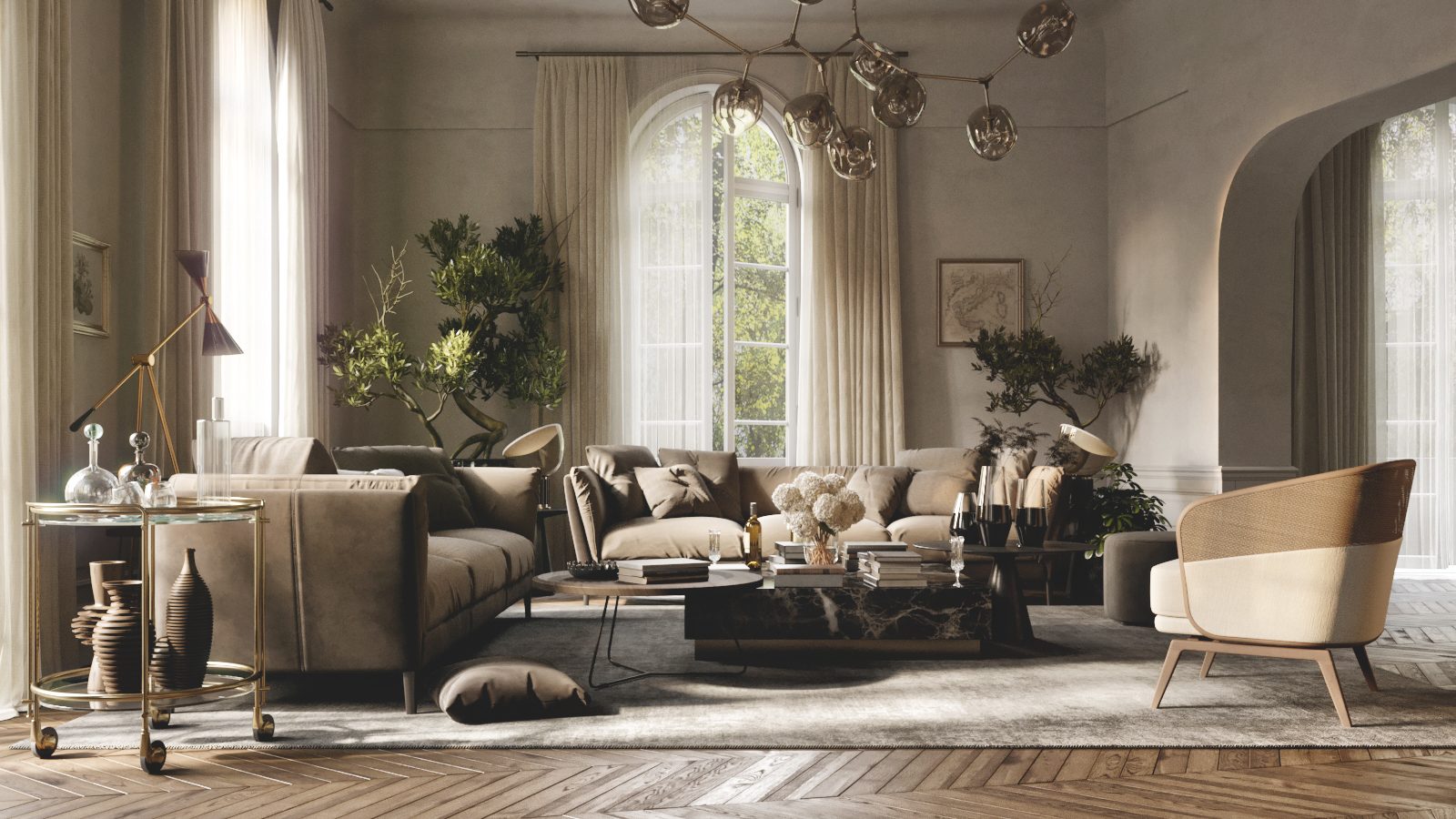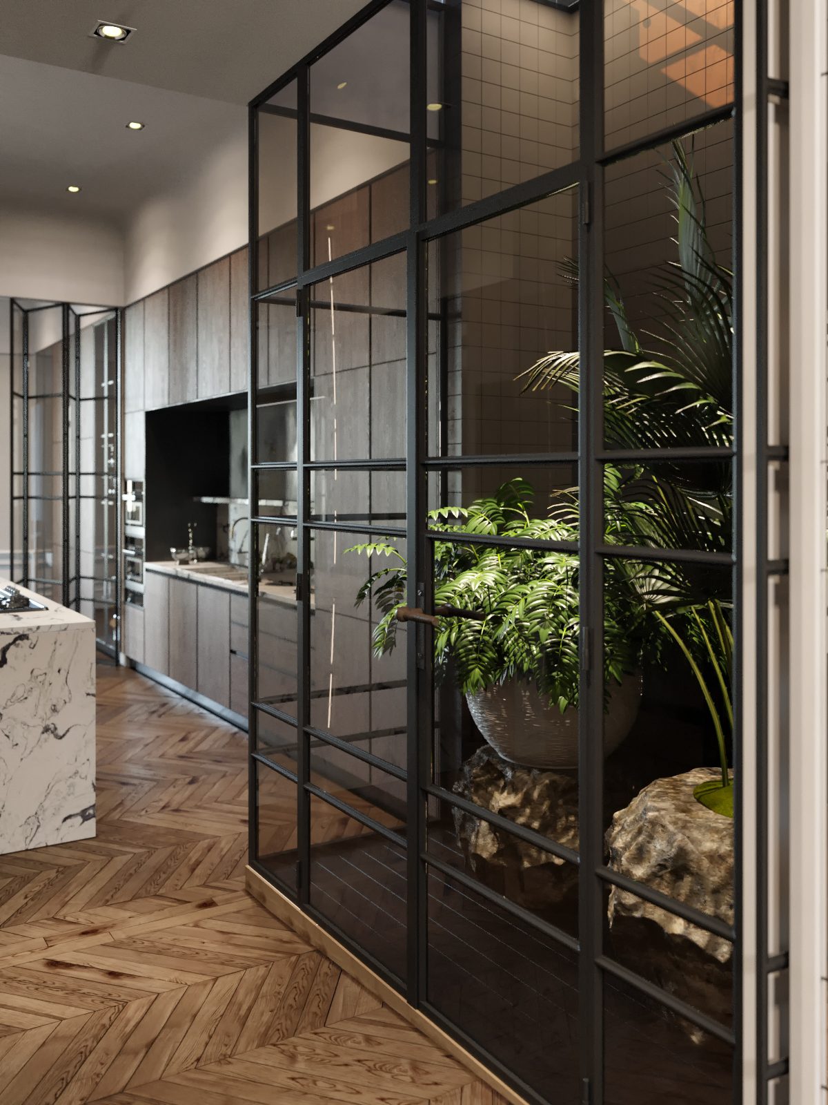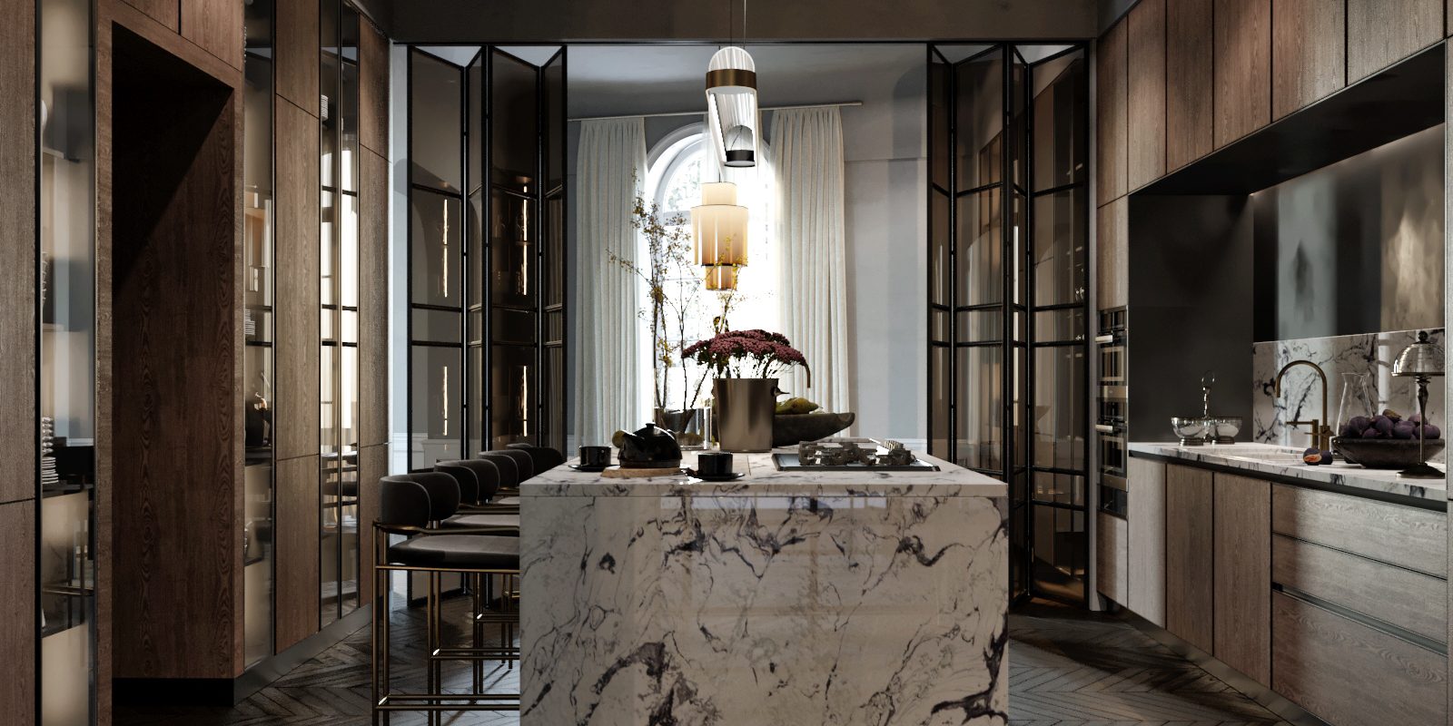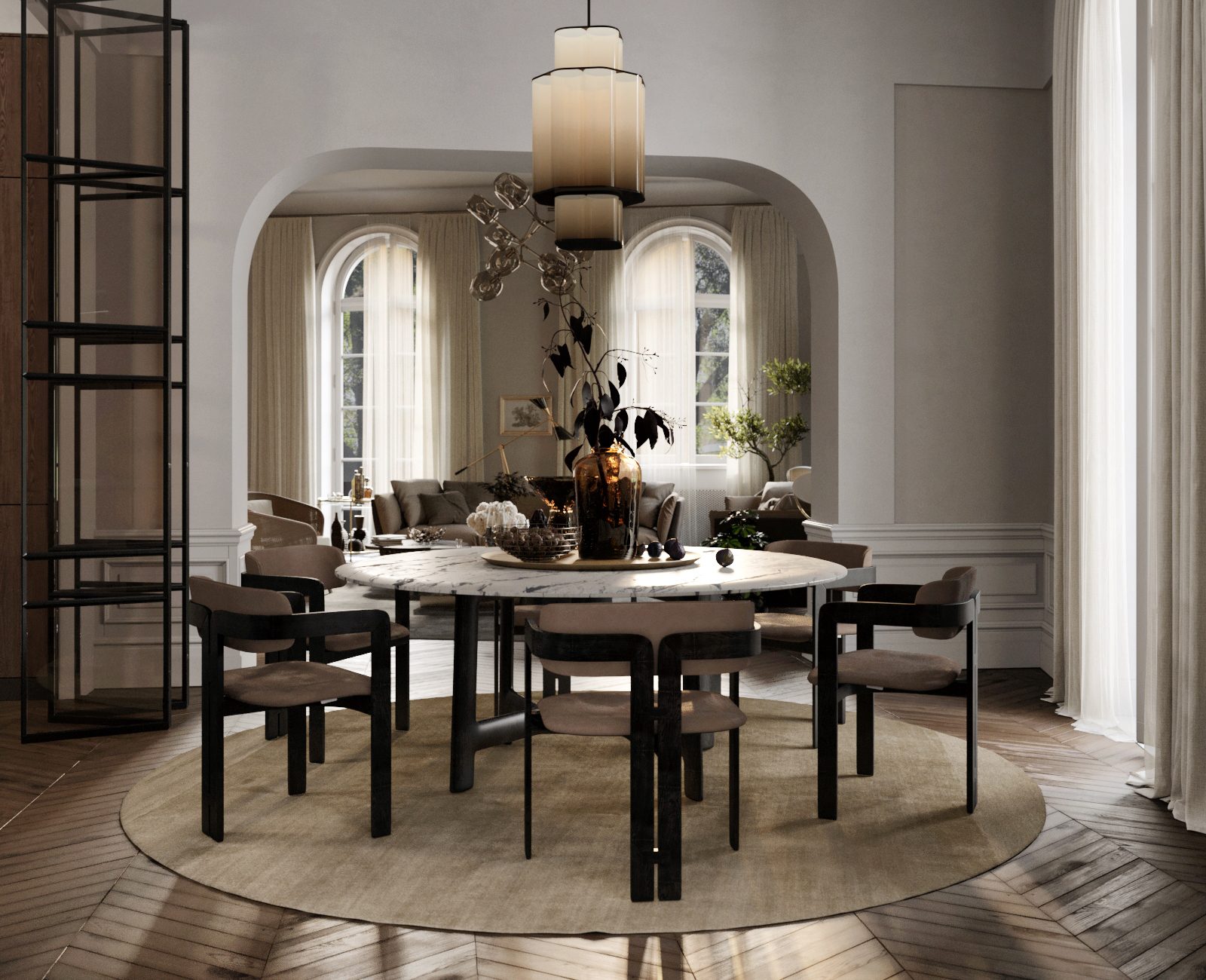 Living room, dining room, kitchen, library, chill room, two winter gardens, master bedroom, guest bedroom, three bathrooms