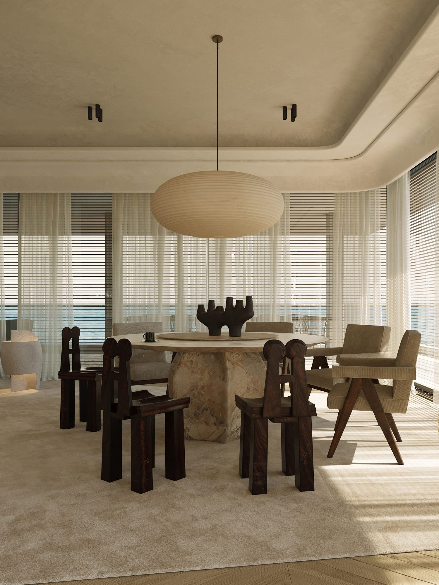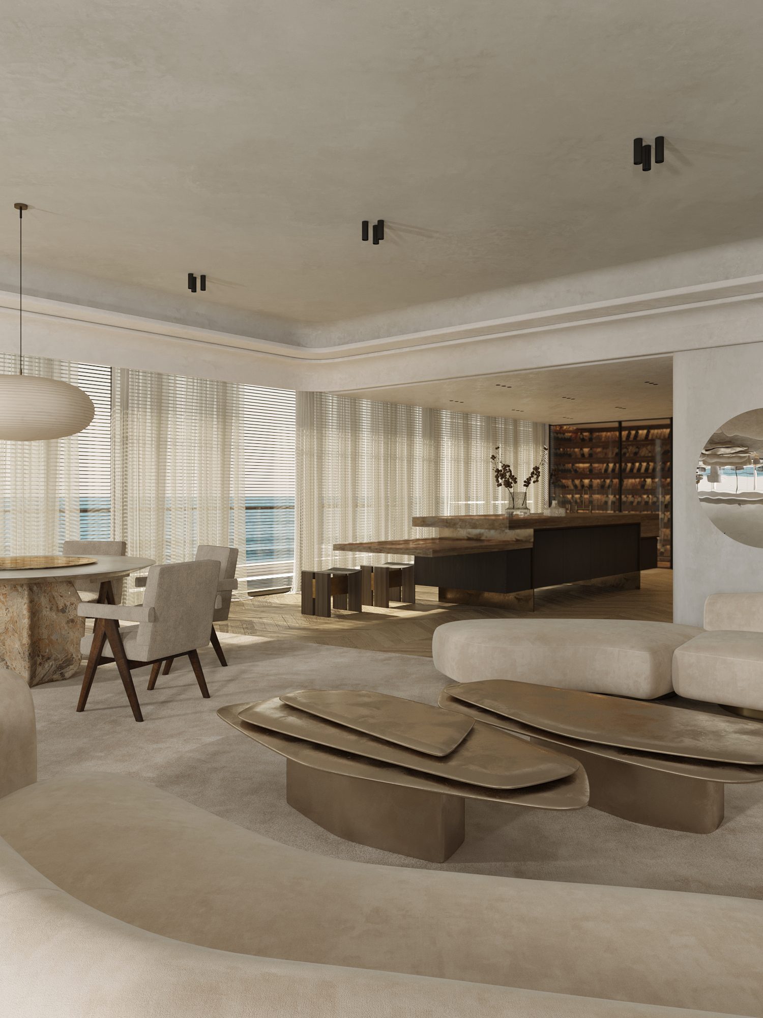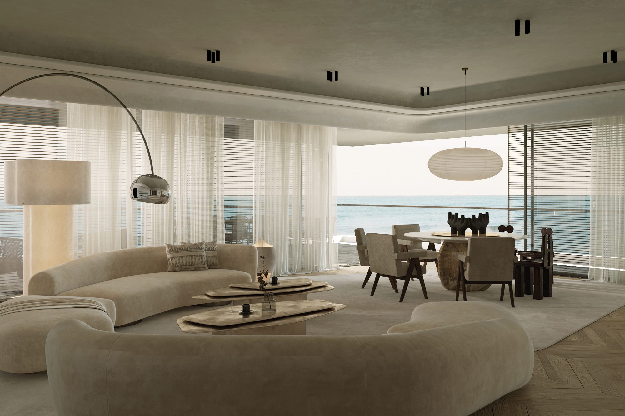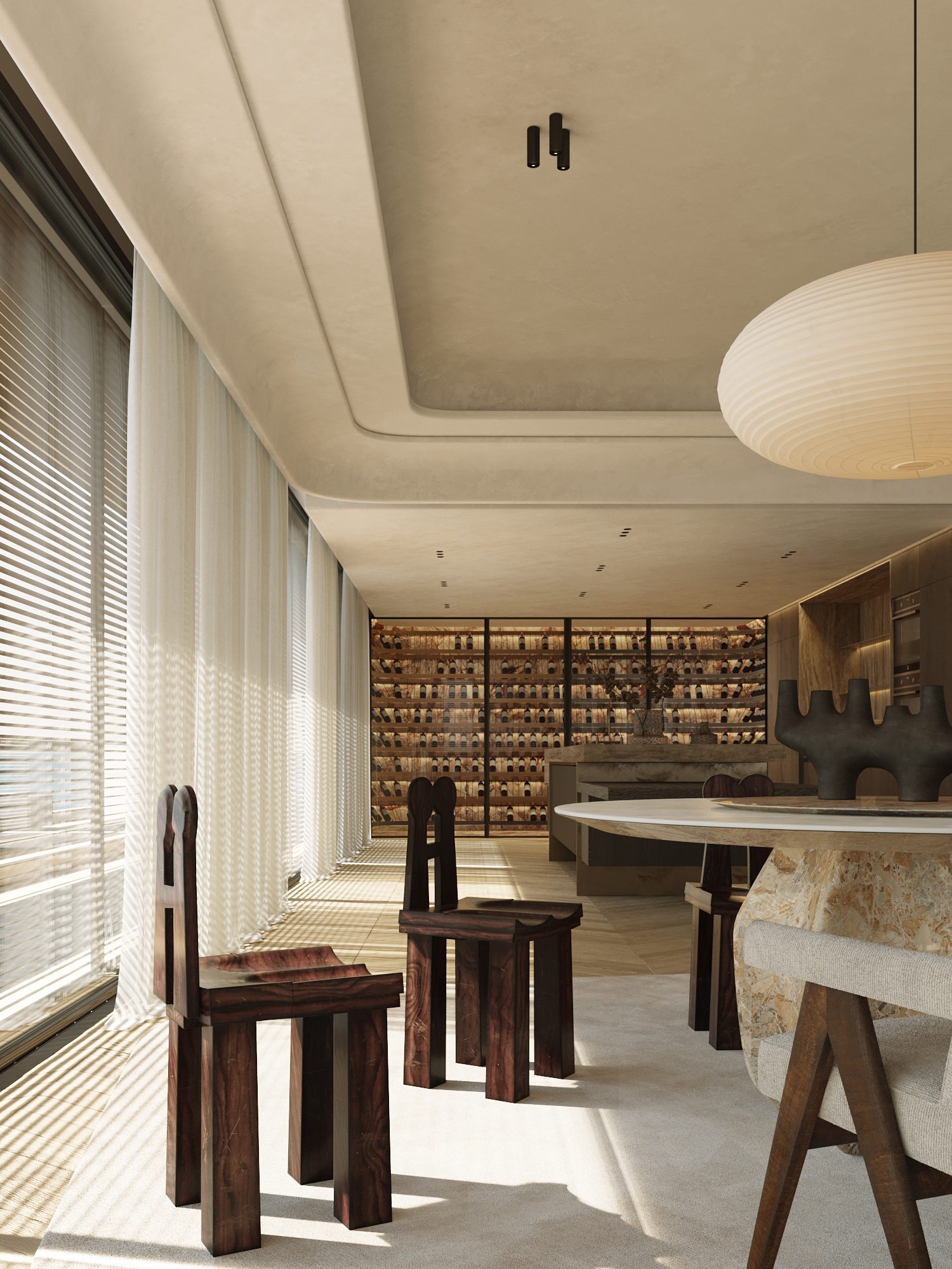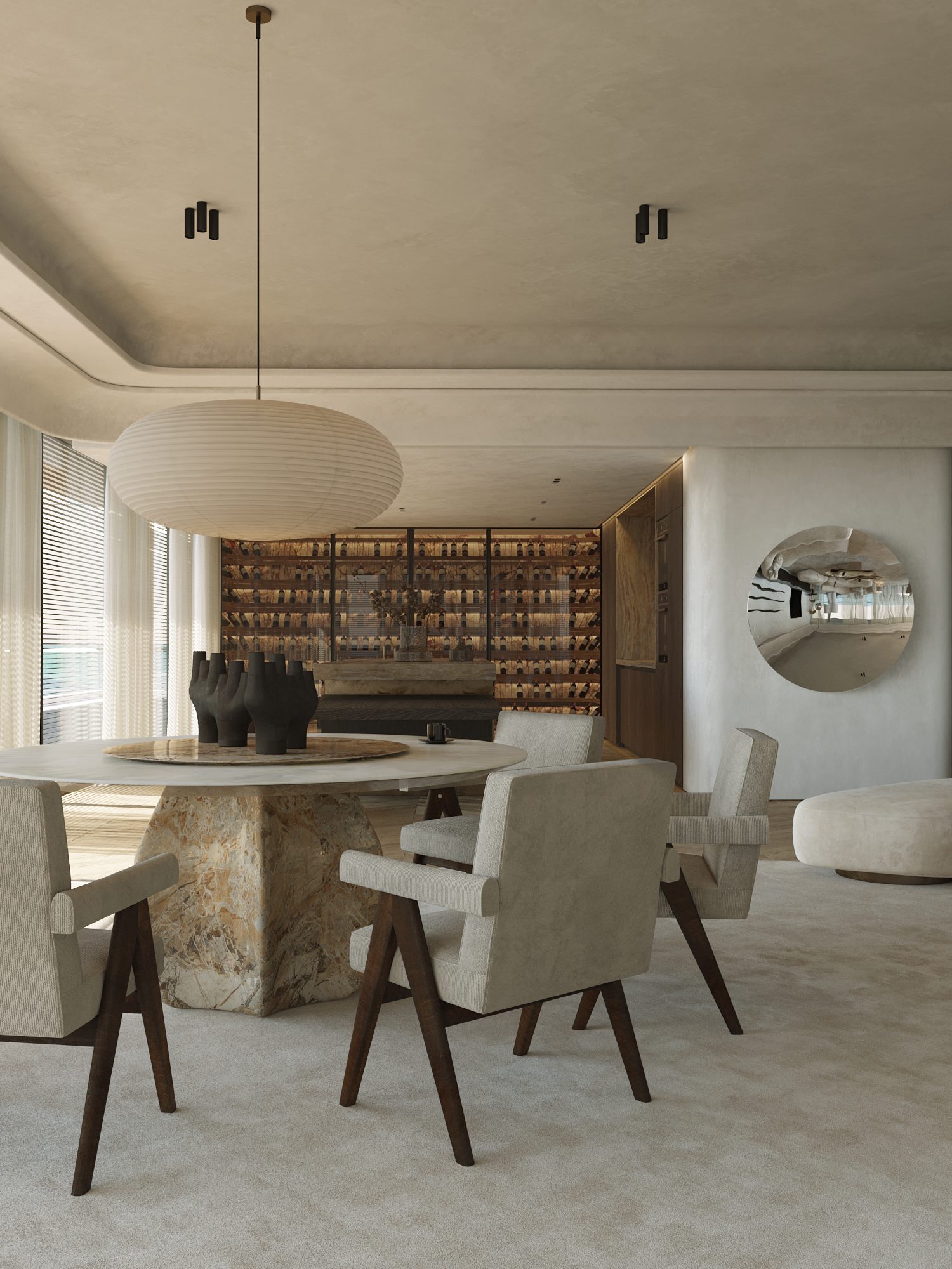 3 bedrooms, 4 bathrooms, living room connected with dining area and kitchen, wardrobes.